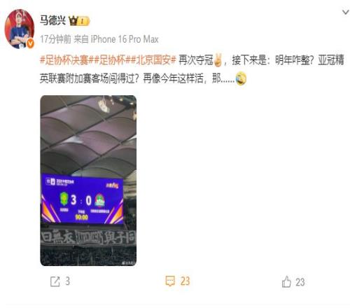 在北京国安夺冠之后,著名记者马德兴指出,“再次夺冠,接下来是:明年咋整?亚冠精英联赛附加赛客场闯得过?再像今年这样活,那”